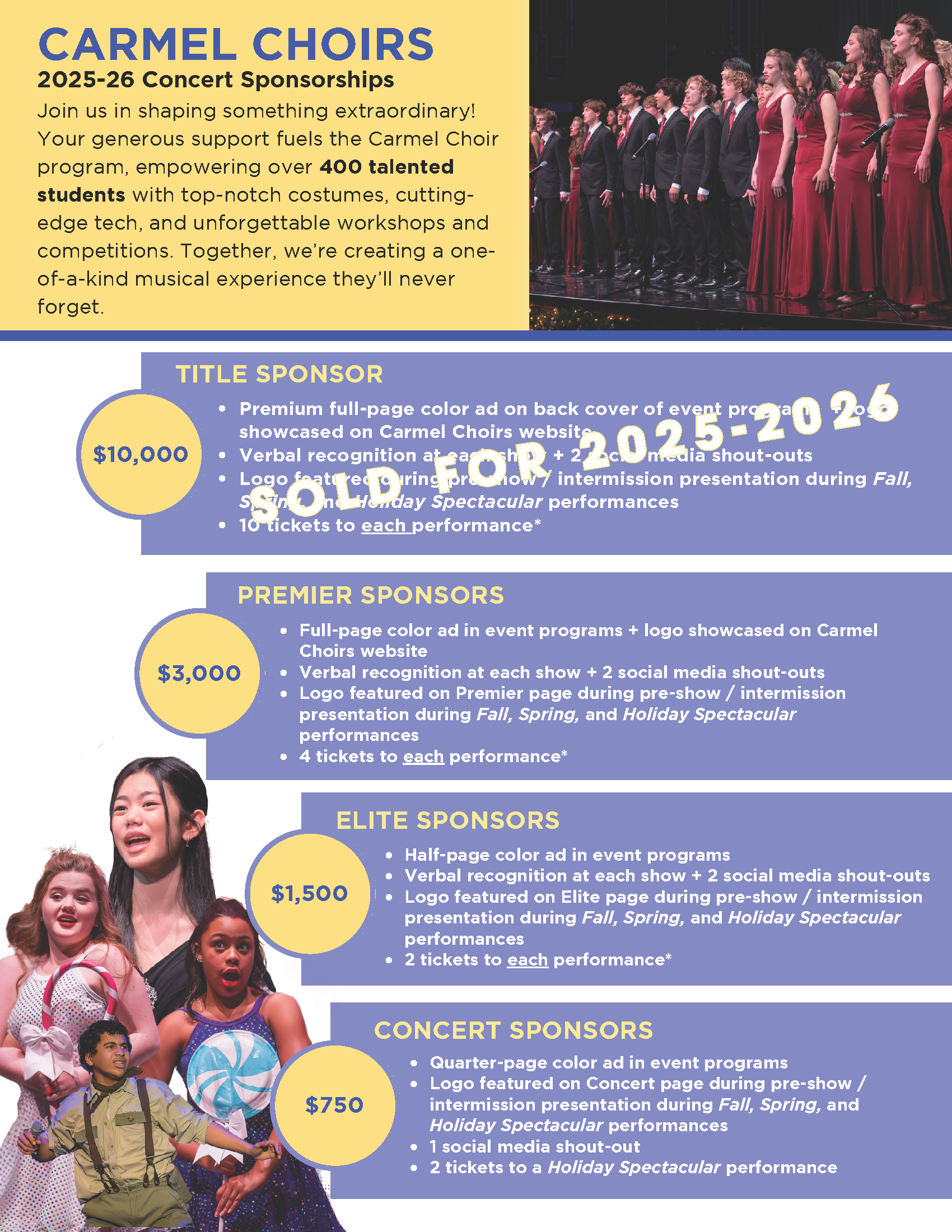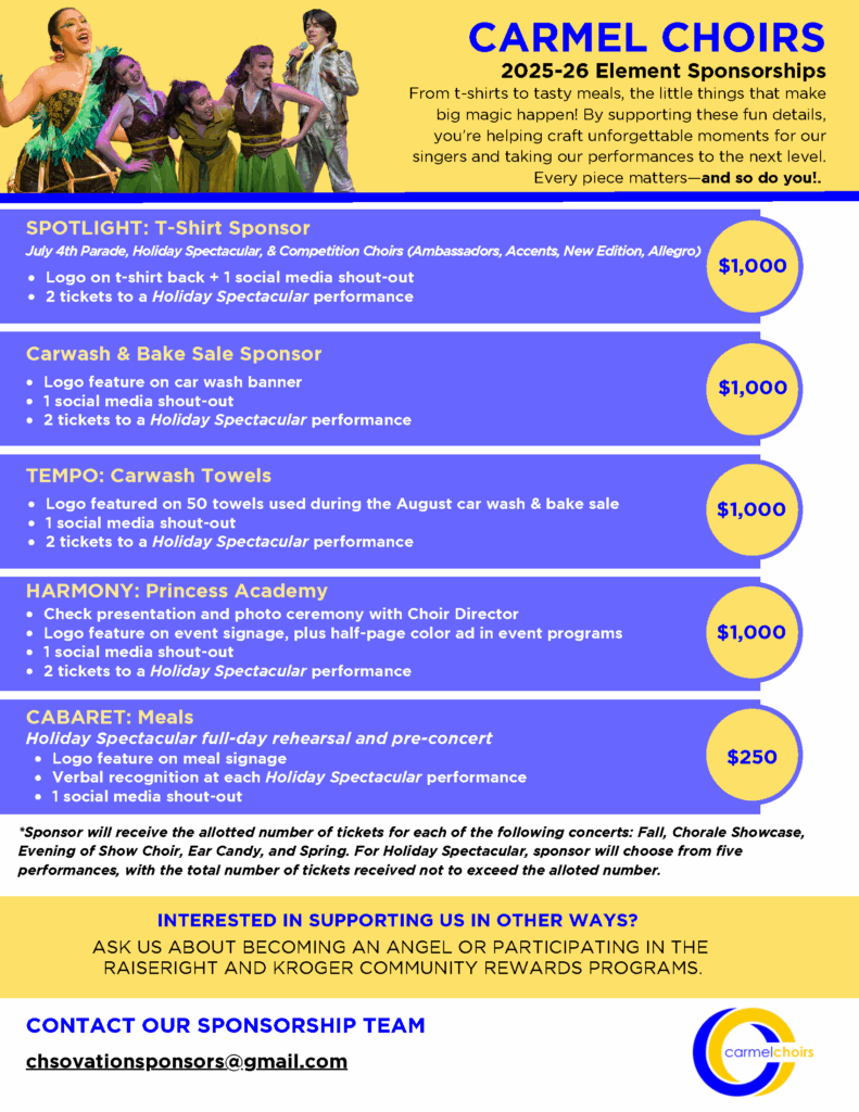 If you are interested in becoming a corporate sponsor for the Carmel High School Choir Program, please contact our Sponsorship Team!